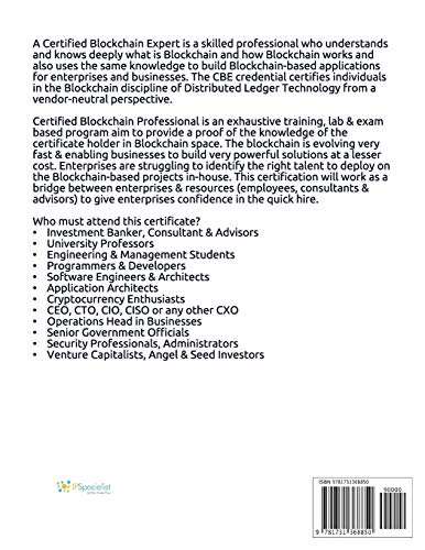 This workbook covers all the information you need to pass the Blockchain Council’s Certified Blockchain Expert v2 exam. The workbook is designed to deliver all information and technical knowledge in-depth for learning with real-life examples and case studies> Covers complete blueprint> Detailed content> Case Study based approach> Pass guarantee> Mind mapsA Certified Blockchain Expert is a skilled professional who understands and knows deeply what is Blockchain and how Blockchain works and also uses the same knowledge to build Blockchain-based applications for enterprises and businesses. The CBE credential certifies individuals in the Blockchain discipline of Distributed Ledger Technology from a vendor-neutral perspective.Certified Blockchain Professional is an exhaustive training, lab & exam based program aim to provide a proof of the knowledge of the certificate holder in Blockchain space. The blockchain is evolving very fast & enabling businesses to build very powerful solutions at a lesser cost. Enterprises are struggling to identify the right talent to deploy on the Blockchain-based projects in-house. This certification will work as a bridge between enterprises & resources (employees, consultants & advisors) to give enterprises confidence in the quick hire.Who must attend this certificate?•Investment Banker, Consultant & Advisors•University Professors•Engineering & Management Students•Programmers & Developers•Software Engineers & Architects•Application Architects•Cryptocurrency Enthusiasts•CEO, CTO, CIO, CISO or any other CXO•Operations Head in Businesses•Senior Government Officials•Security Professionals, Administrators•Venture Capitalists, Angel & Seed Investors