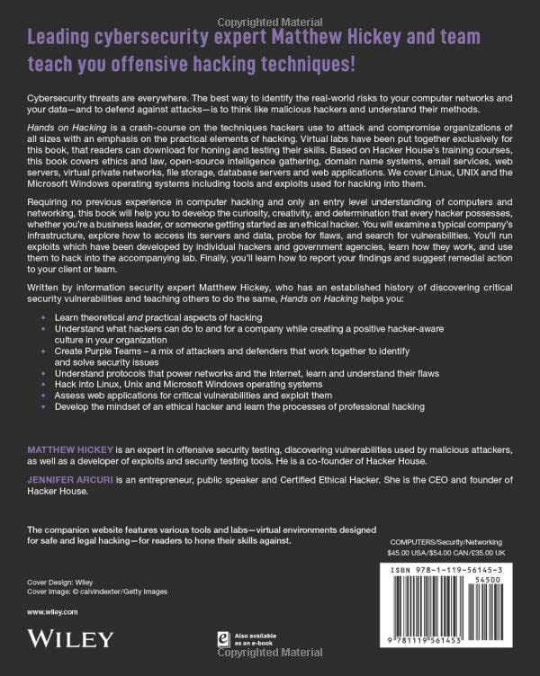 Written by world-renowned cybersecurity experts and educators, Hands-On Hacking teaches entry-level professionals seeking to learn ethical hacking techniques. If you are looking to understand penetration testing and ethical hacking, this book takes you from basic methods to advanced techniques in a structured learning format.